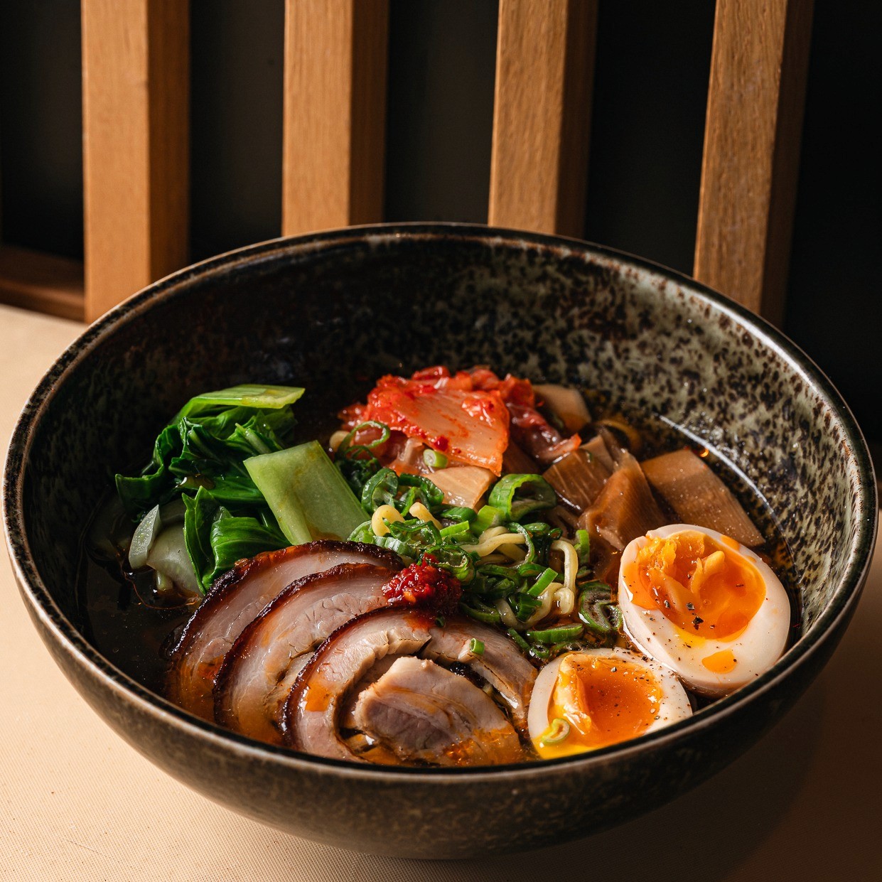 Le bouillon: Miso, Legumes et Boeuf Suisse en cuisson lente pendant des heures et après filtrés Les ingredients: Chashu de Porc Suisse / nos nouilles de blé / Oeuf suisse mi- cuit mariné / Mais / ognons fanes suisses / Pak Choi suisse / Kimchi / Huile et sauce piquante