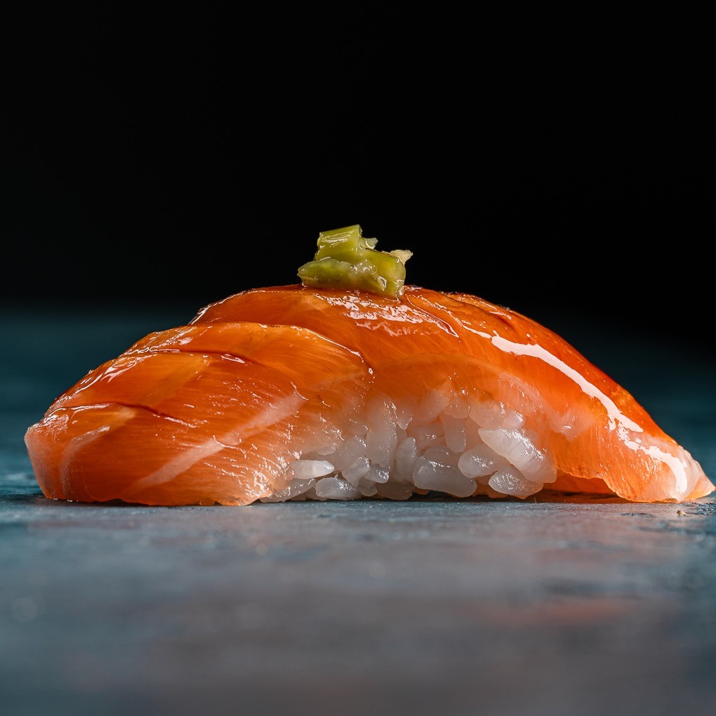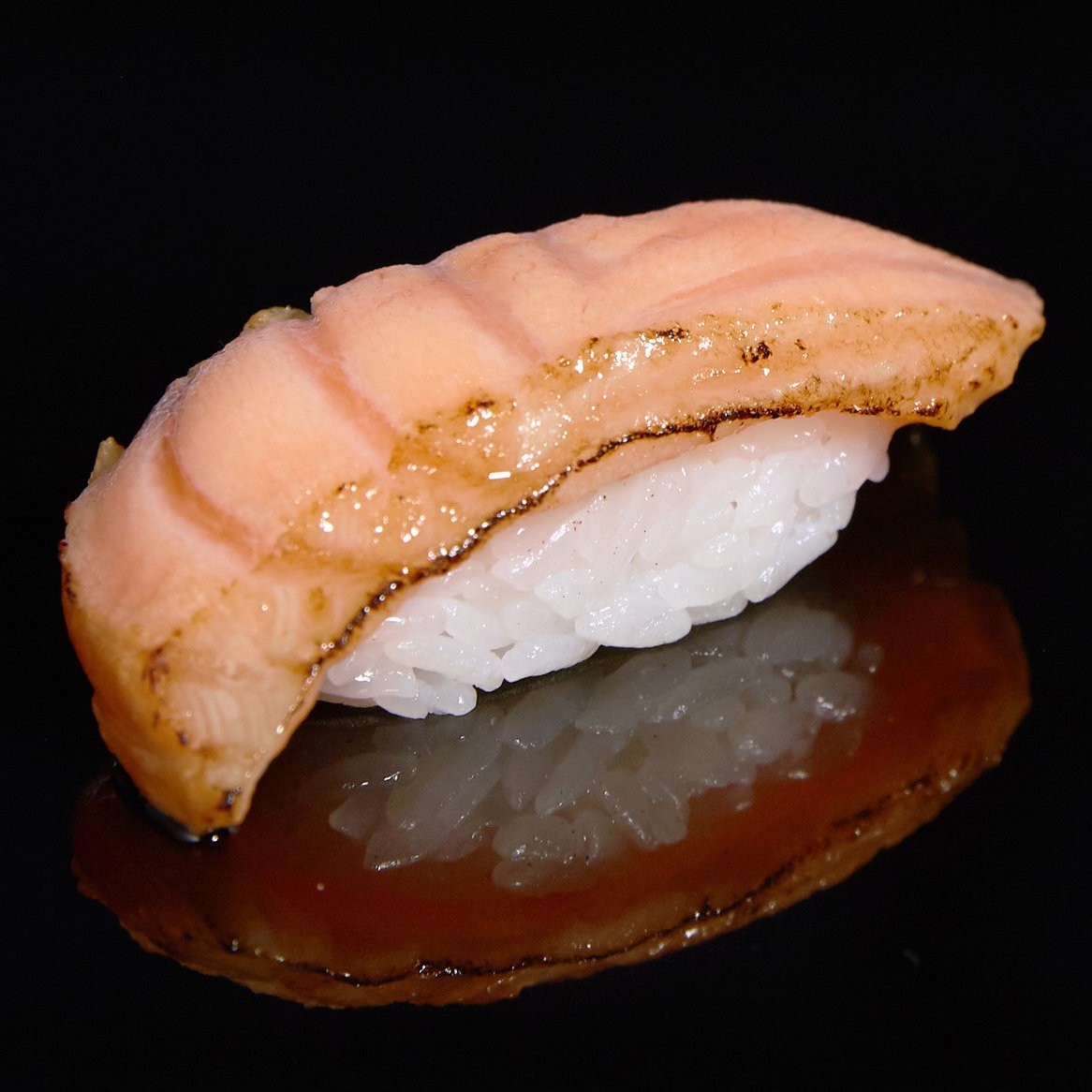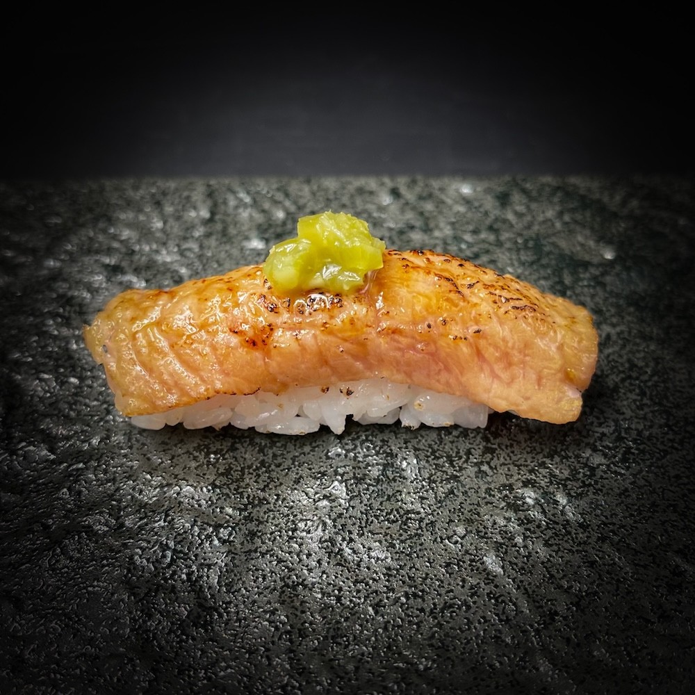La partie grasse et plus rare du saumon légèrement saisie et surmontée de wasabi frais
