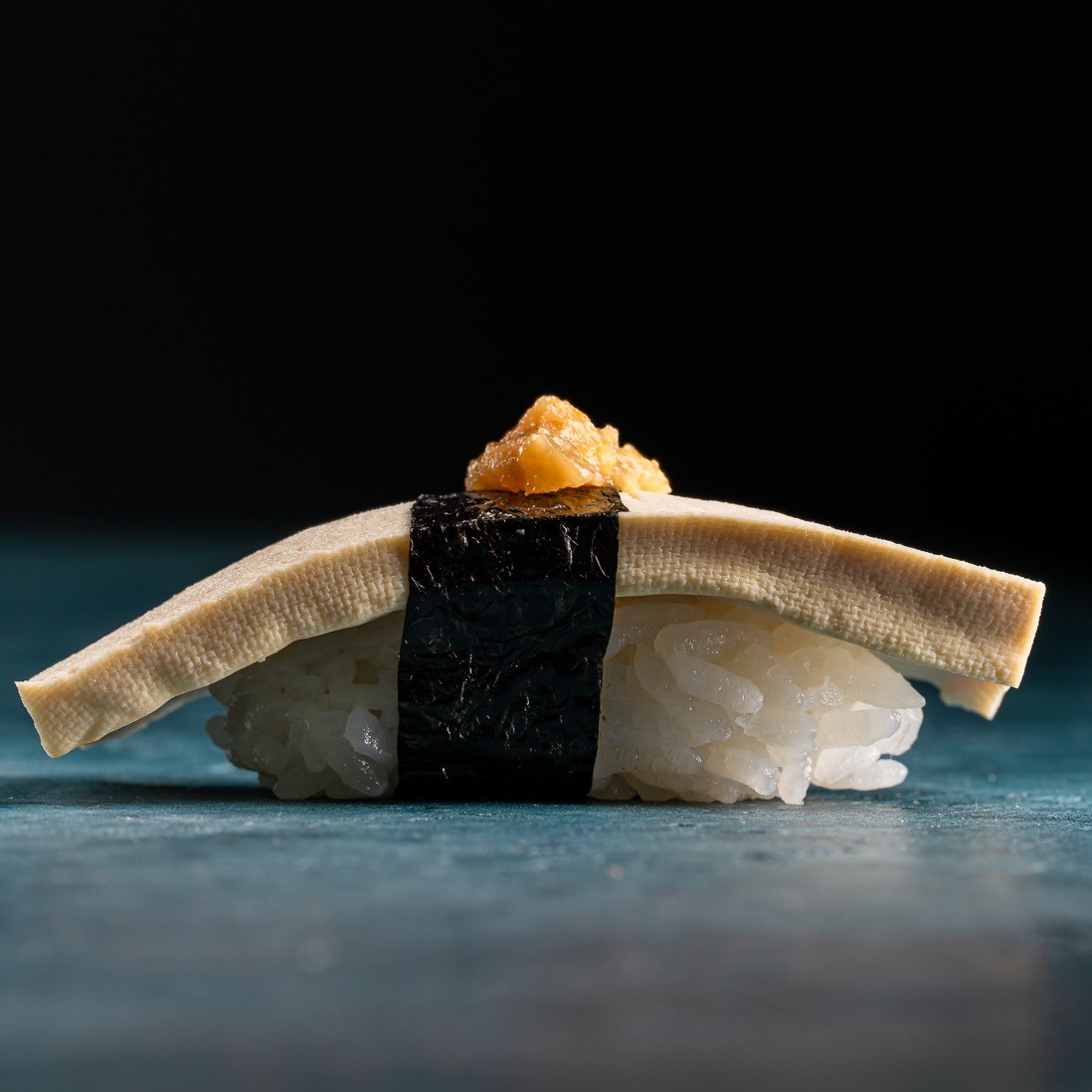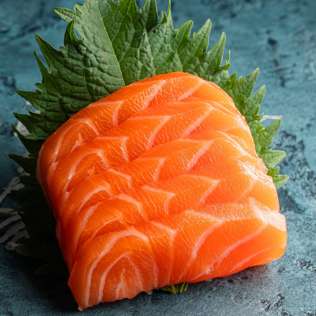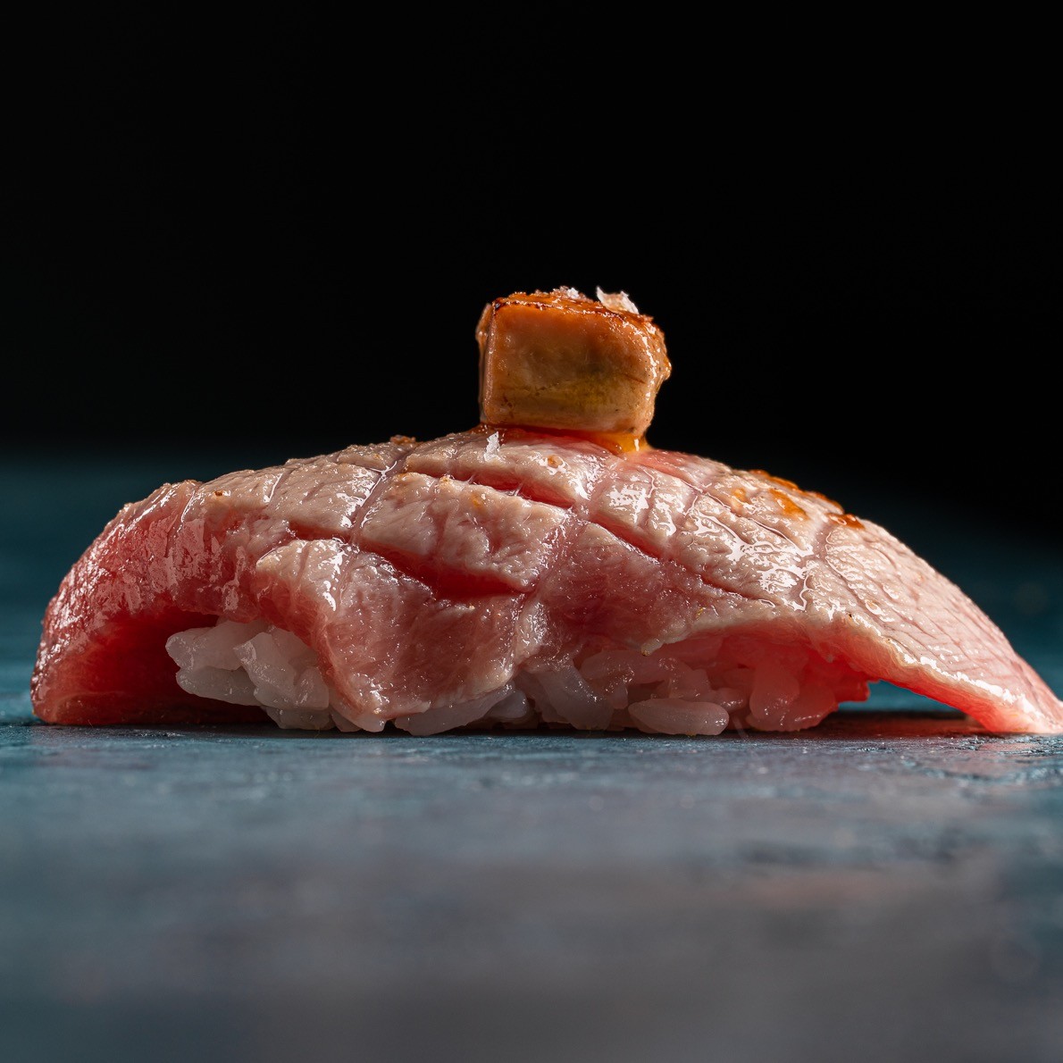 La partie grasse et plus rare du saumon légèrement saisie et surmontée de wasabi frais