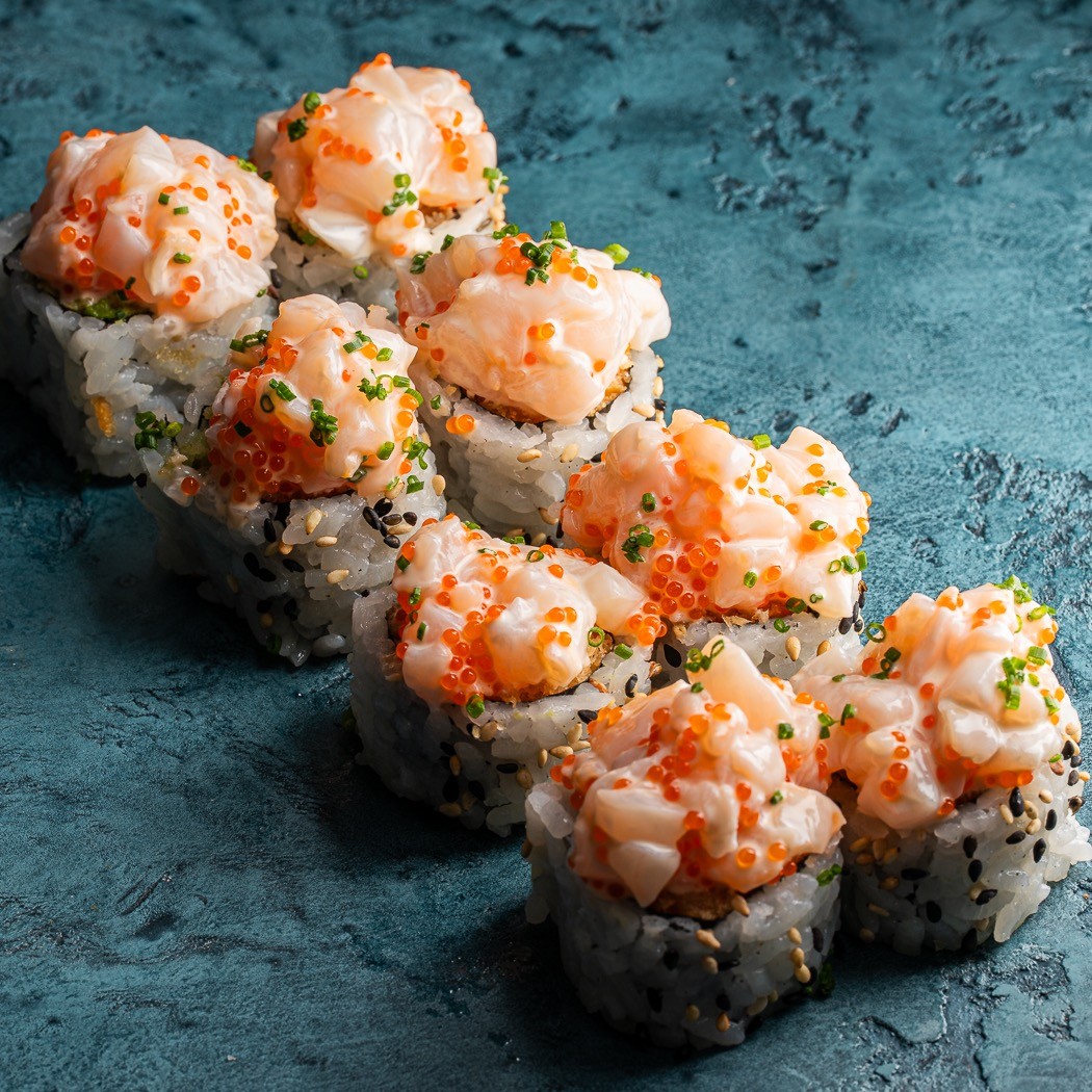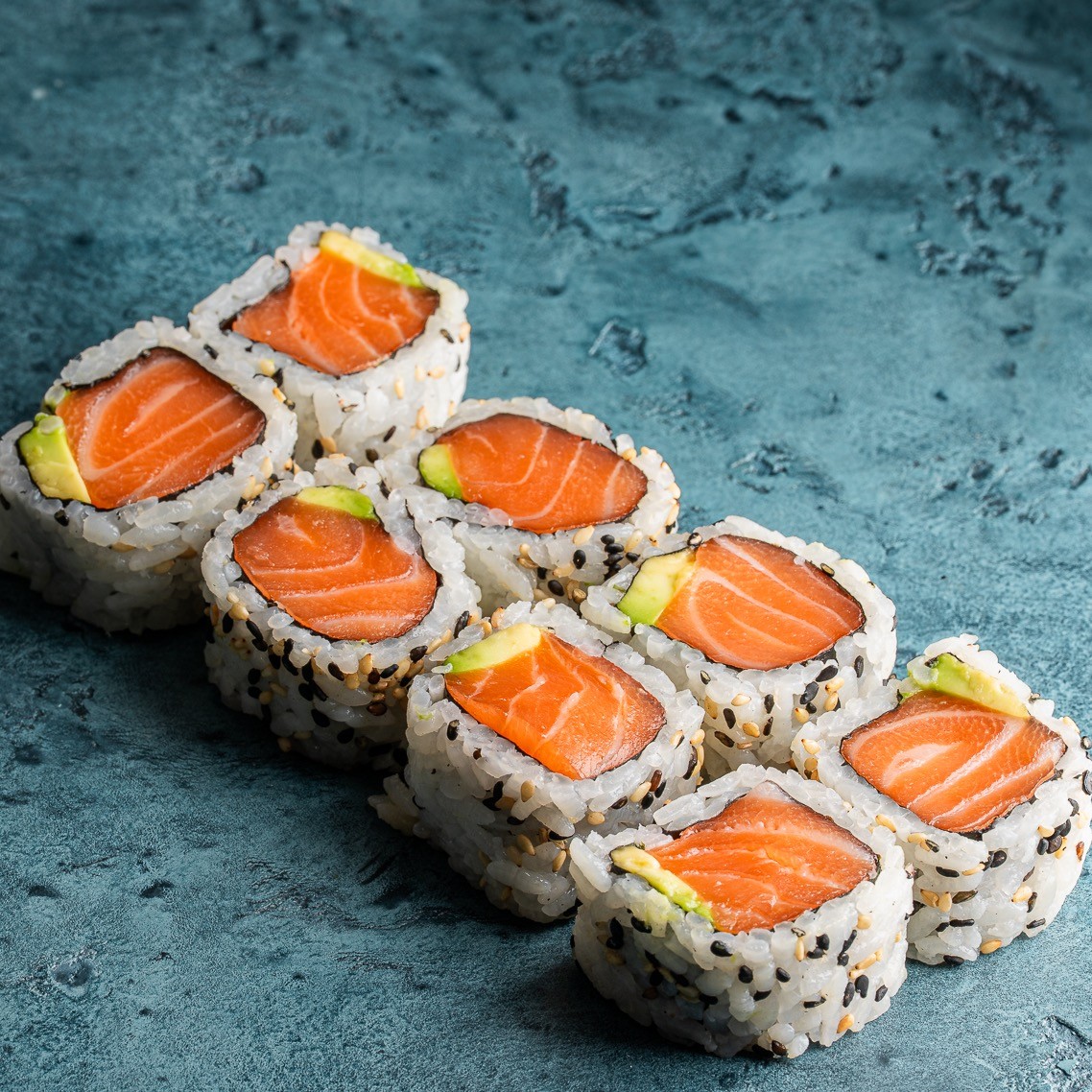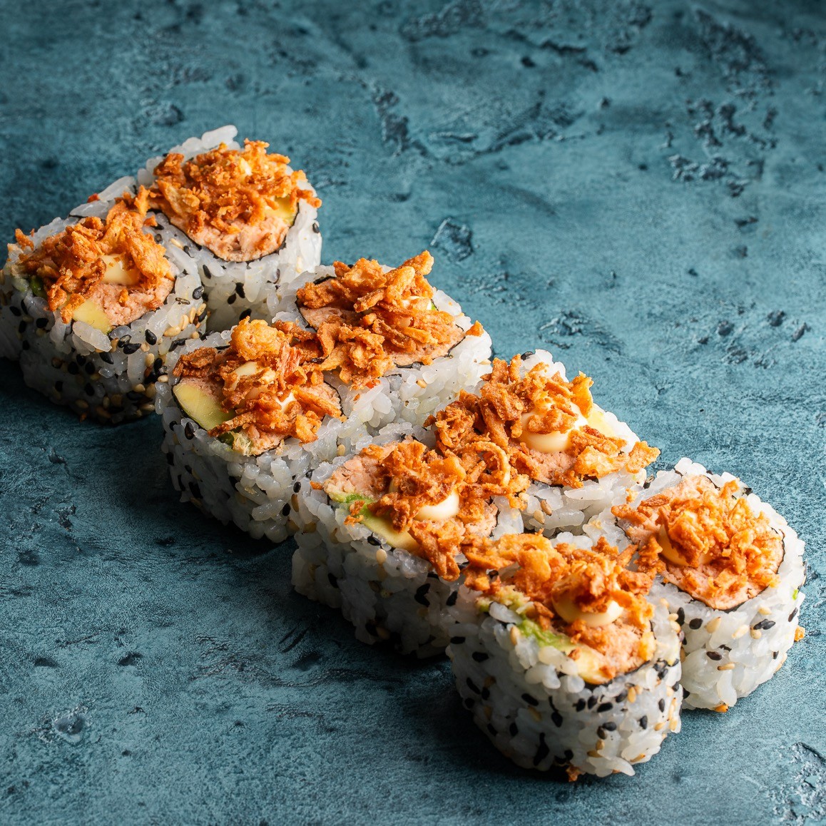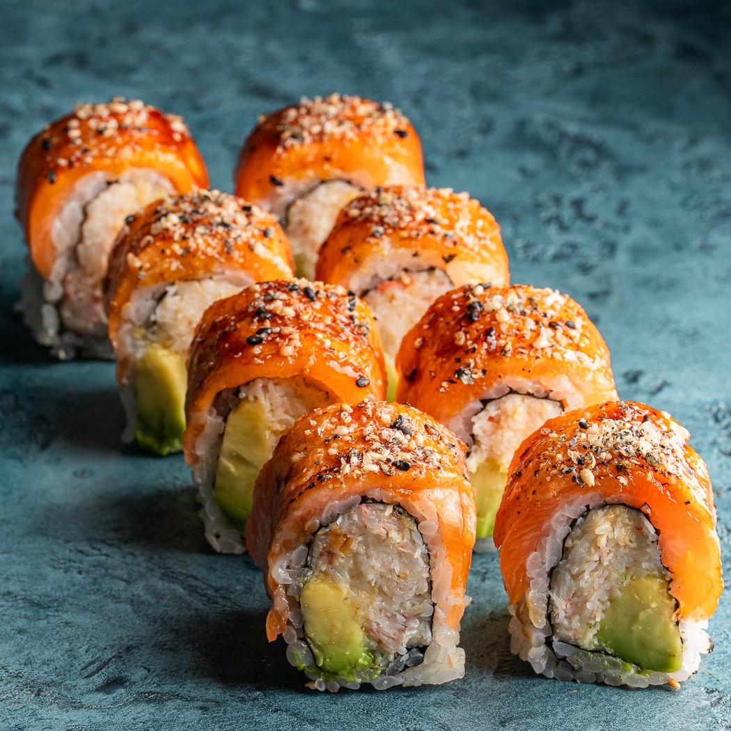 Un uramaki au saumon cuit, légèrement relevé et subtilement croquant