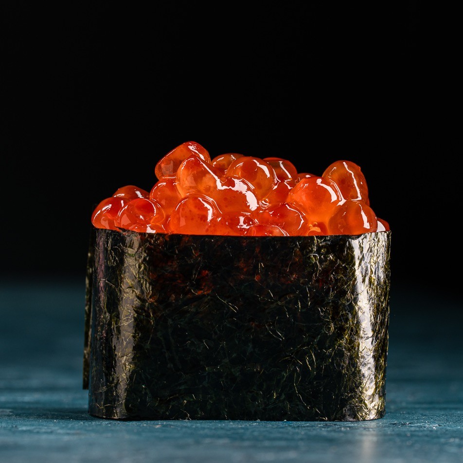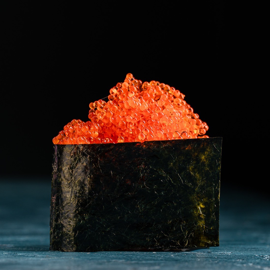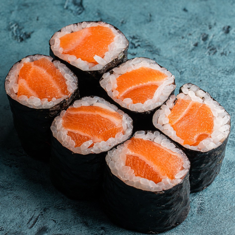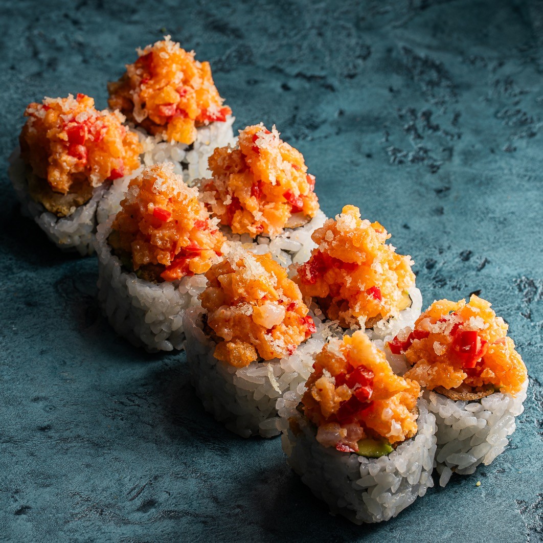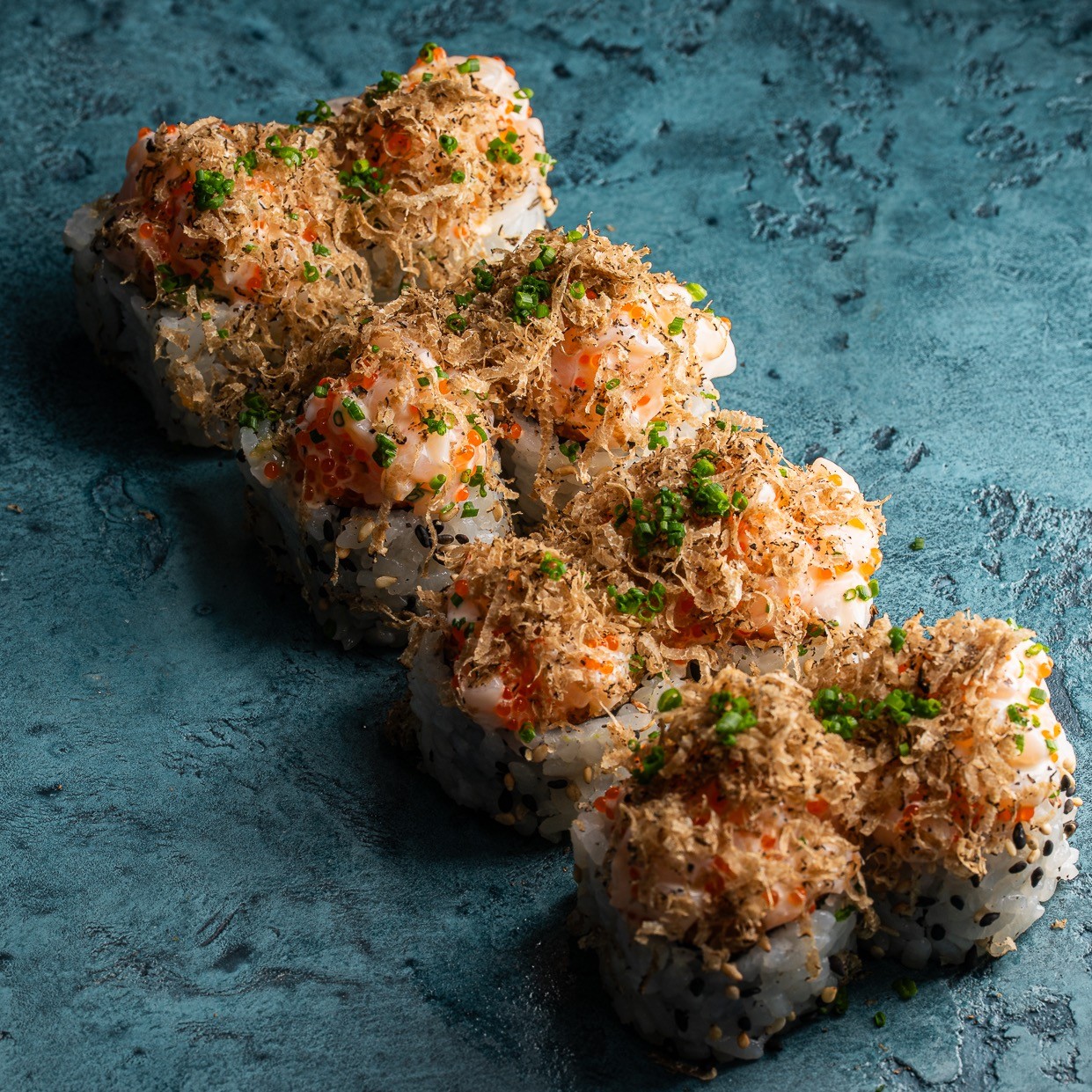 Un uramaki au saumon cuit, légèrement relevé et subtilement croquant