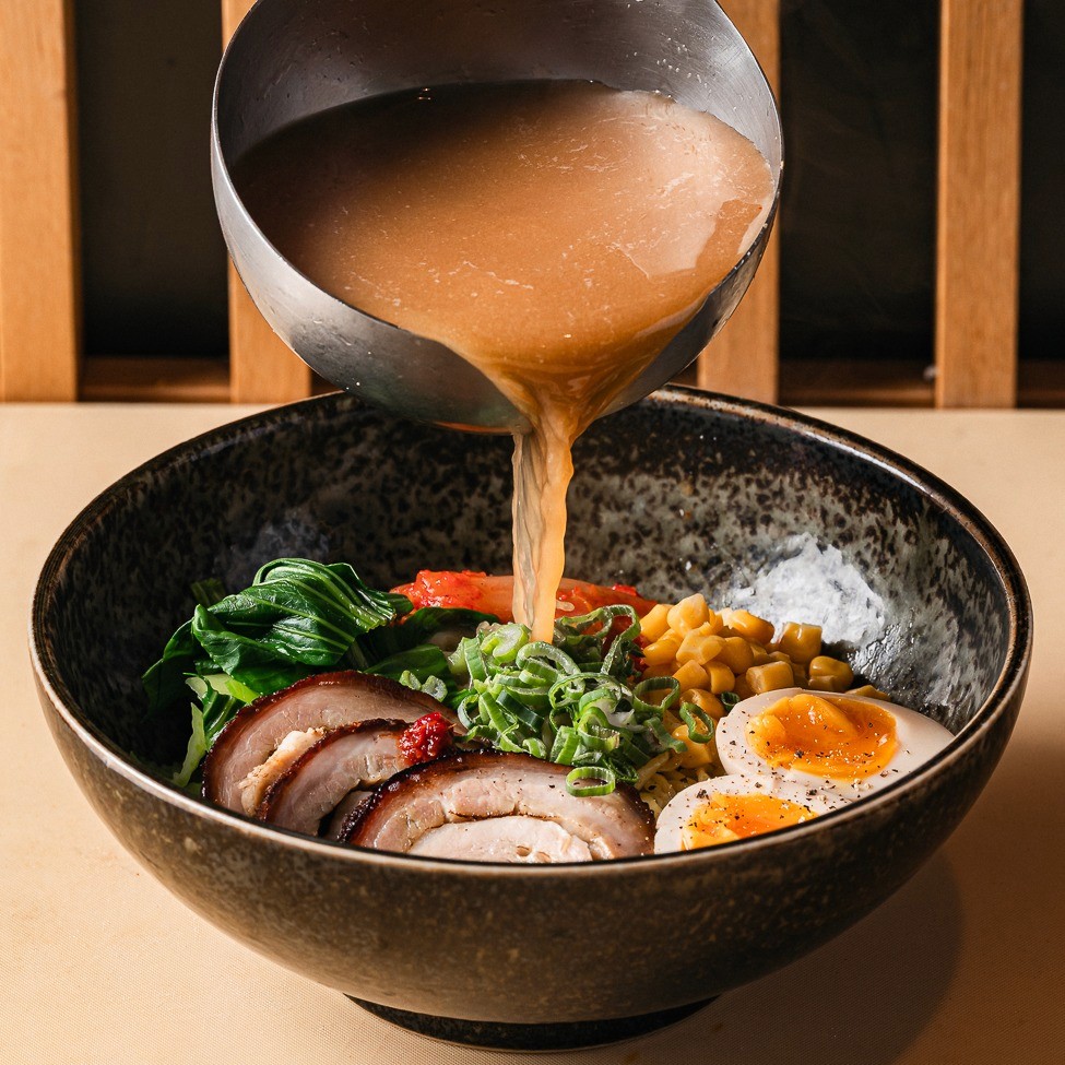 Le bouillon: Soja, Legumes et Boeuf Suisse en cuisson lente pendant des heures et après filtrés Les ingredients : Chashu de Porc Suisse / nos nouilles de blé / Oeuf suisse mi- cuit et mariné / pousses de bamboo / ognons fanes suisses / Pak Choi suisse / Kimchi / Huile et sauce piquante