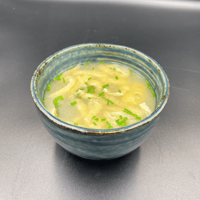 La soupe miso classique avec nos deux Tofu signature (tofu frit et tofu artisanal de Coinsins), algues et ognons fanes