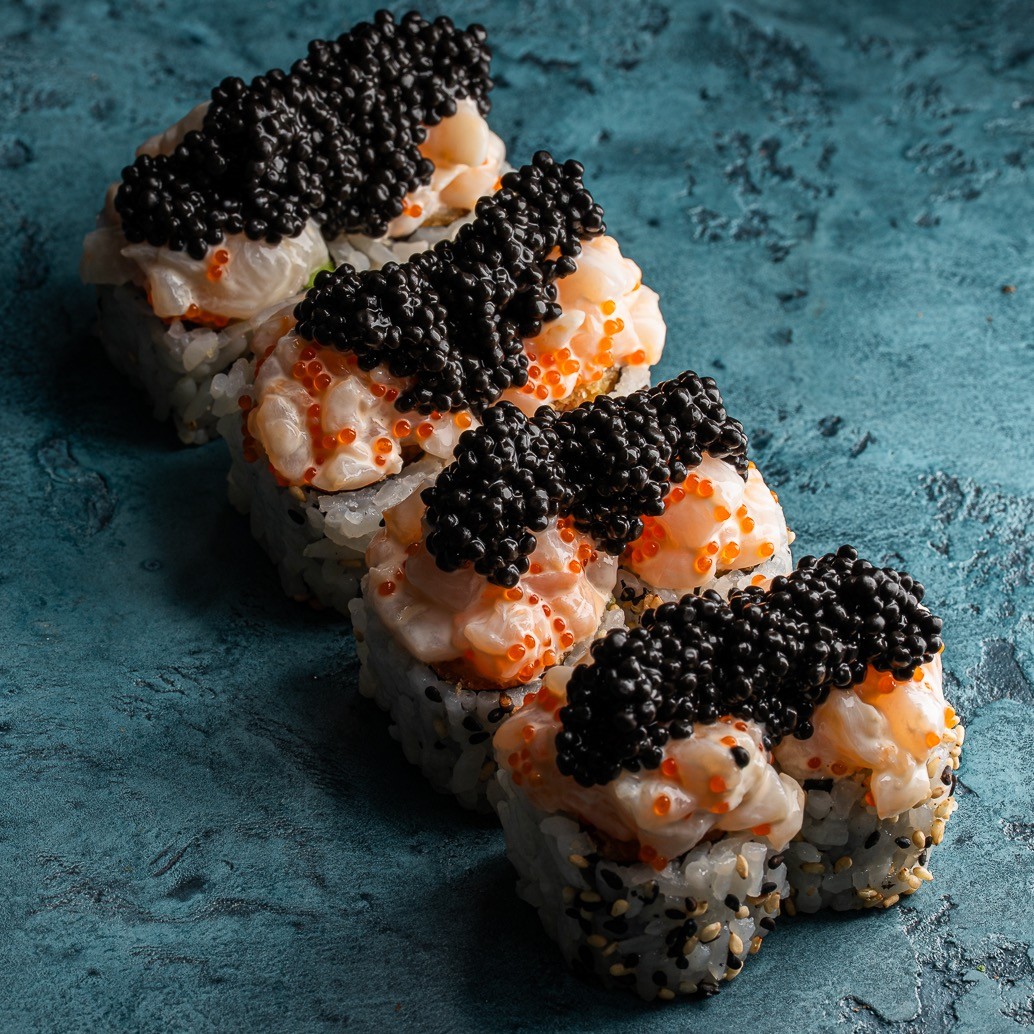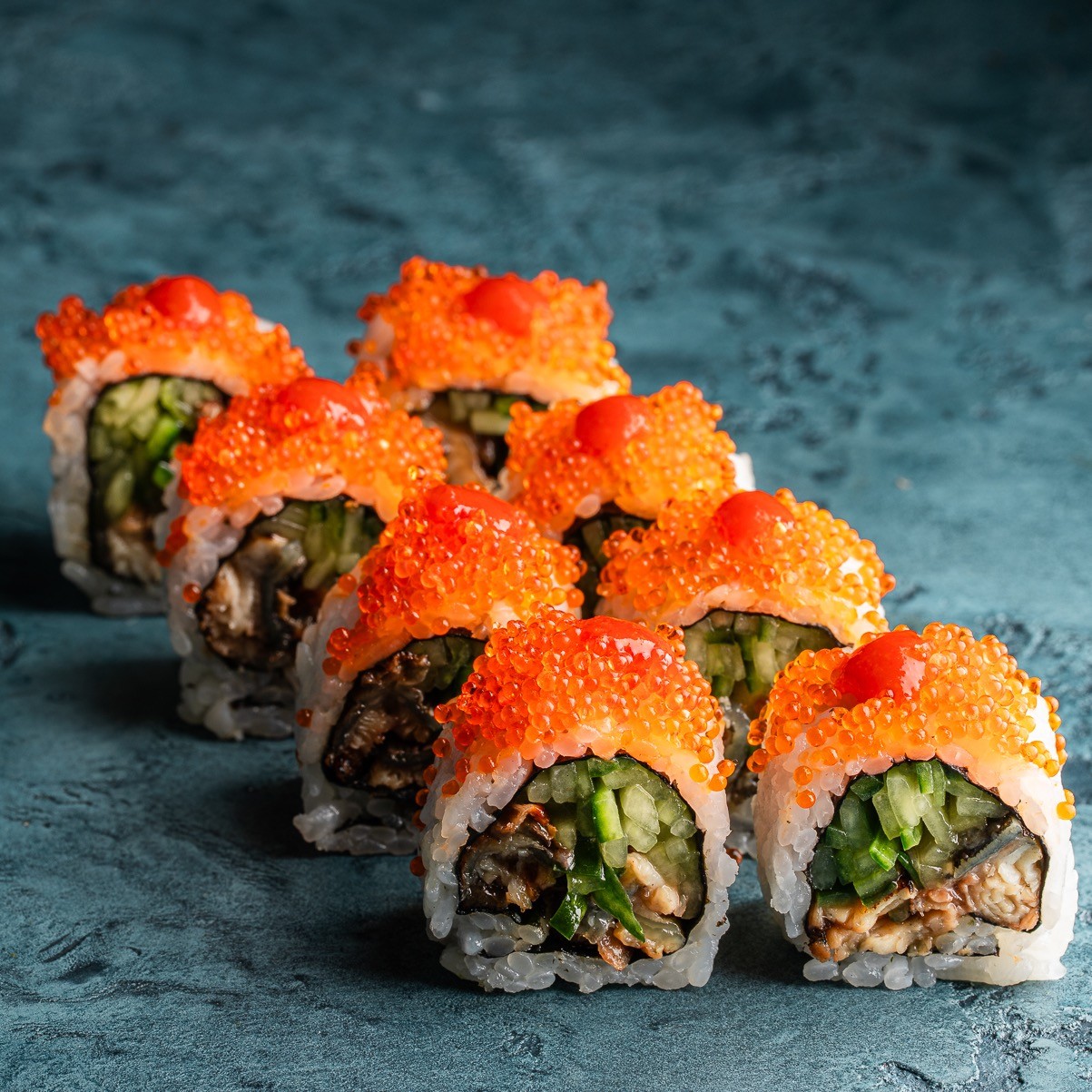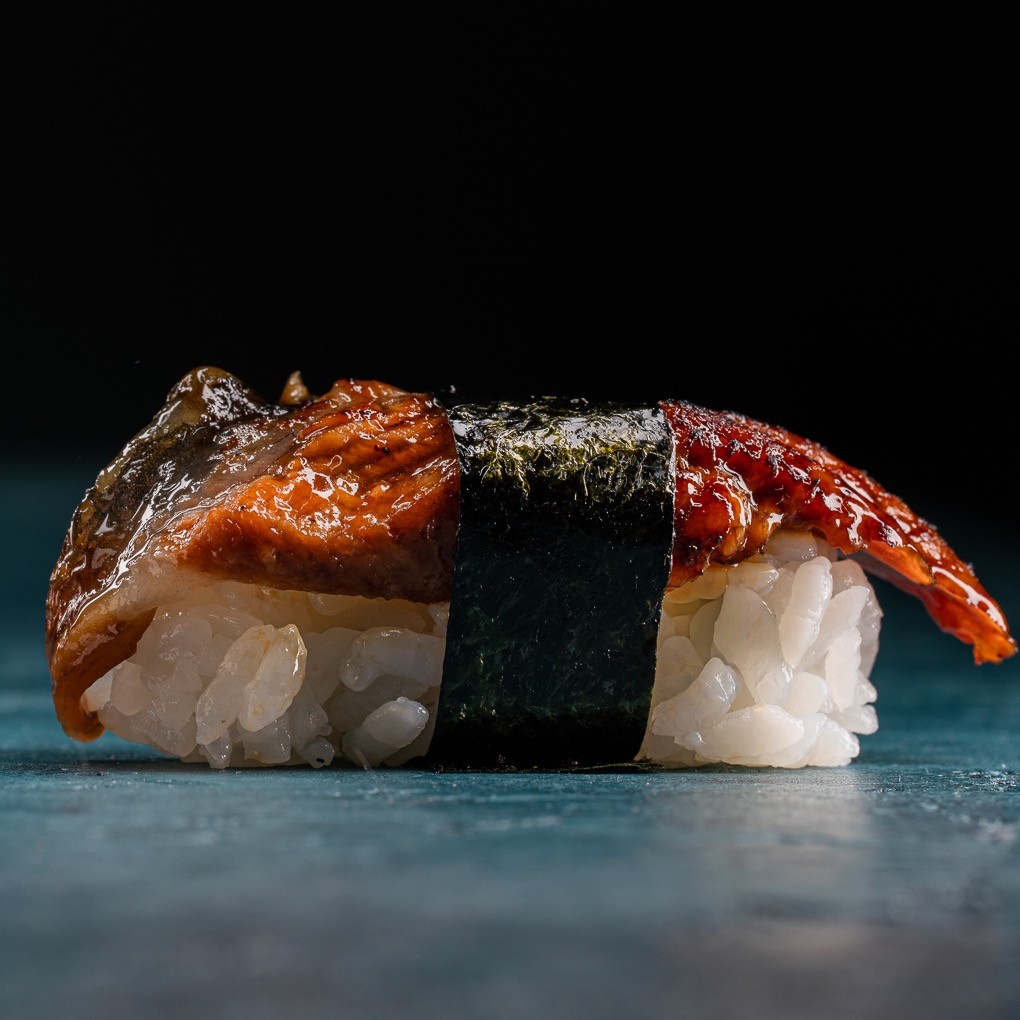 Crevette croustillante & avocat, surmonté par de l'anguille fondante épicée et flambée